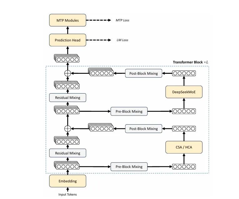 DeepSeek-V4 仍然是 Transformer + DeepSeekMoE + MTP 的底盘,相比 V3 系列做了三处关键升级: