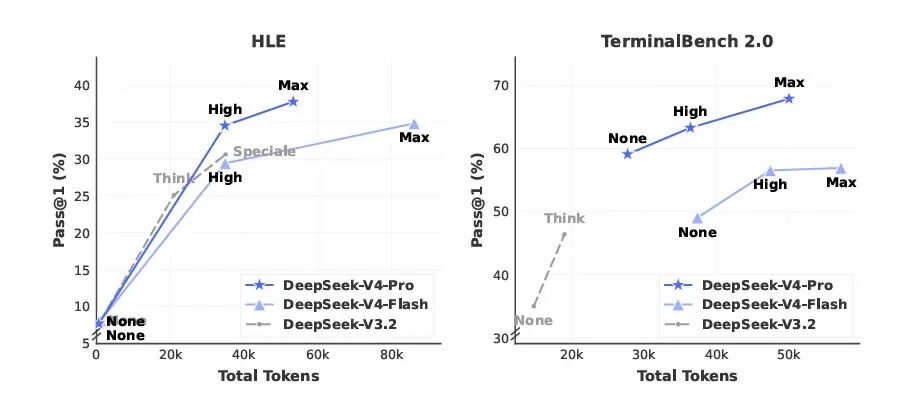 这张图最有价值的信息是:V4-Pro 在相同 token 预算下,比 V3.2 的 token 效率更高。单位思考 token 换来的性能增益更多。混合稀疏注意力加 Muon 共同作用的结果。