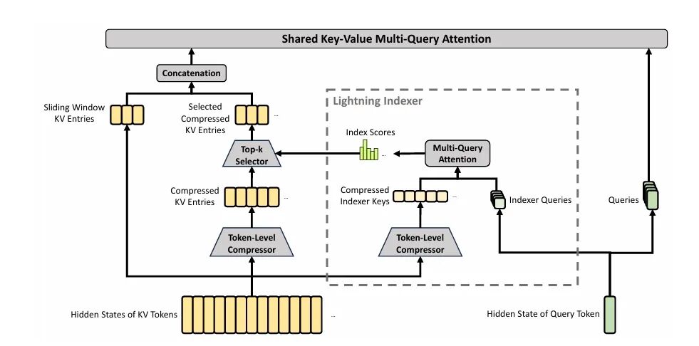 Lightning Indexer 本质是一个低秩多查询的小 attention:用一组专门的 indexer query 对所有压缩后的 indexer key 算分,再 ReLU 加权求和打个分,最后取 top-k。indexer 的 QK 路径全程跑在 FP4 上,是后面 KV Cache 体积能压到 V3.2 的 10% 的关键之一。