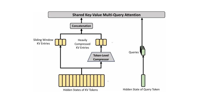 为什么需要 HCA?CSA 虽然能精读细节,但 top-k 的稀疏选择天然会漏掉一些全局摘要级的信息。HCA 把 1M tokens 直接压成约 7800 个 entry,所有 query 都能看,相当于一个永远在线的全局摘要通道。