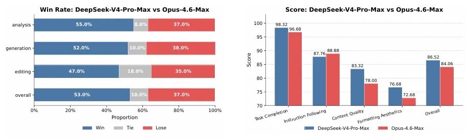 中文功能性写作对 Gemini-3.1-Pro 的胜率 62.7% 比 34.1%;主要原因是 Gemini 经常用自己的风格偏好覆盖用户的明确要求。创意写作上指令遵循胜率 60.0%、写作质量胜率 77.5%;最难的多轮加复杂指令子集里,Claude Opus 4.5 仍以 52.0% 比 45.9% 胜出。30 项中文白领任务对比 Opus-4.6-Max,综合非负率 63%——V4 在任务完成和内容质量上更强,格式美观还是 Opus 更胜一筹。