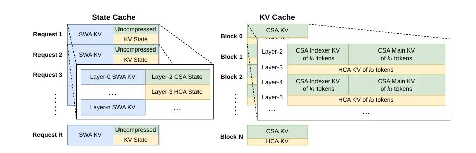 V4 的 KV Cache 是异构的:CSA 有压缩 KV 加 indexer KV,HCA 有更激进的压缩 KV,所有层还有 SWA 滑窗 KV,CSA/HCA 还要管未压缩的尾巴 token。