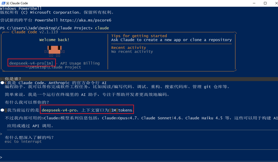 我们为了确认链接成功,可以问下它是谁,用的是哪家大模型,确定回复为deepseek-v4-pro。那么,这个时候你就可以愉快地使用这个CC和Deepseek V4 Pro开启AI编程对话之旅了。
