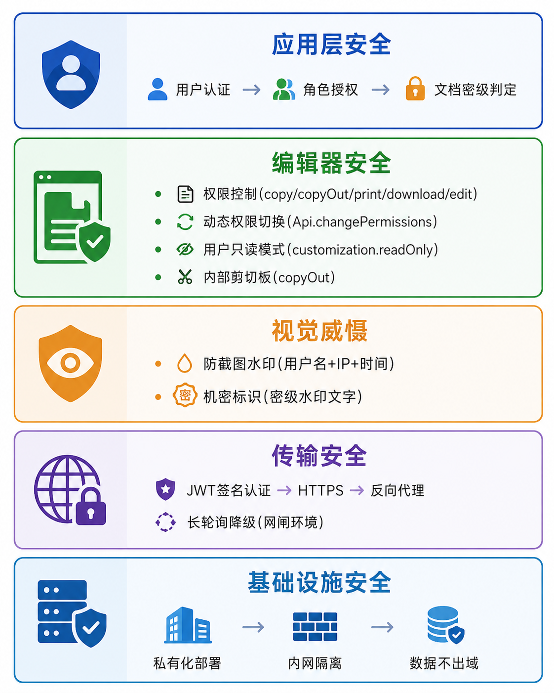 OnlyOffice 中国版针对这些痛点,提供了一套完整的安全增强方案。本文将结合实际业务场景,讲解如何利用这些功能构建多层文档安全防护体系。
