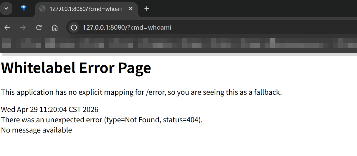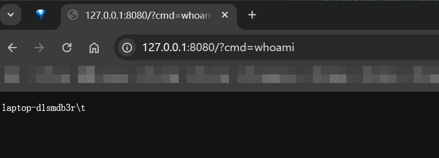 访问 http://127.0.0.1:8080/?cmd=whoami,任意路径带上 cmd 参数都能触发,不需要特定路径:
