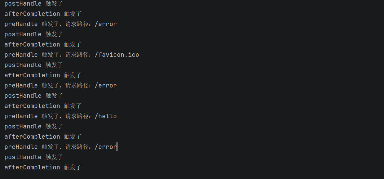 控制台可以看到三个方法依次触发:preHandle → postHandle → afterCompletion。
