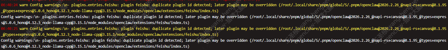 openclaw 插件重复异常,飞书插件重复。 原因:腾讯云自带的龙虾本身安装了飞书渠道,自己又安装了第三方渠道,导致了冲突。第三方渠道:
