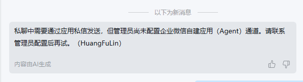 私聊中需要通过应用私信发送,但管理员尚未配置企业微信自建应用(Agent)通道。请联系管理员配置后再试。有什么办法可以给我解决吗?