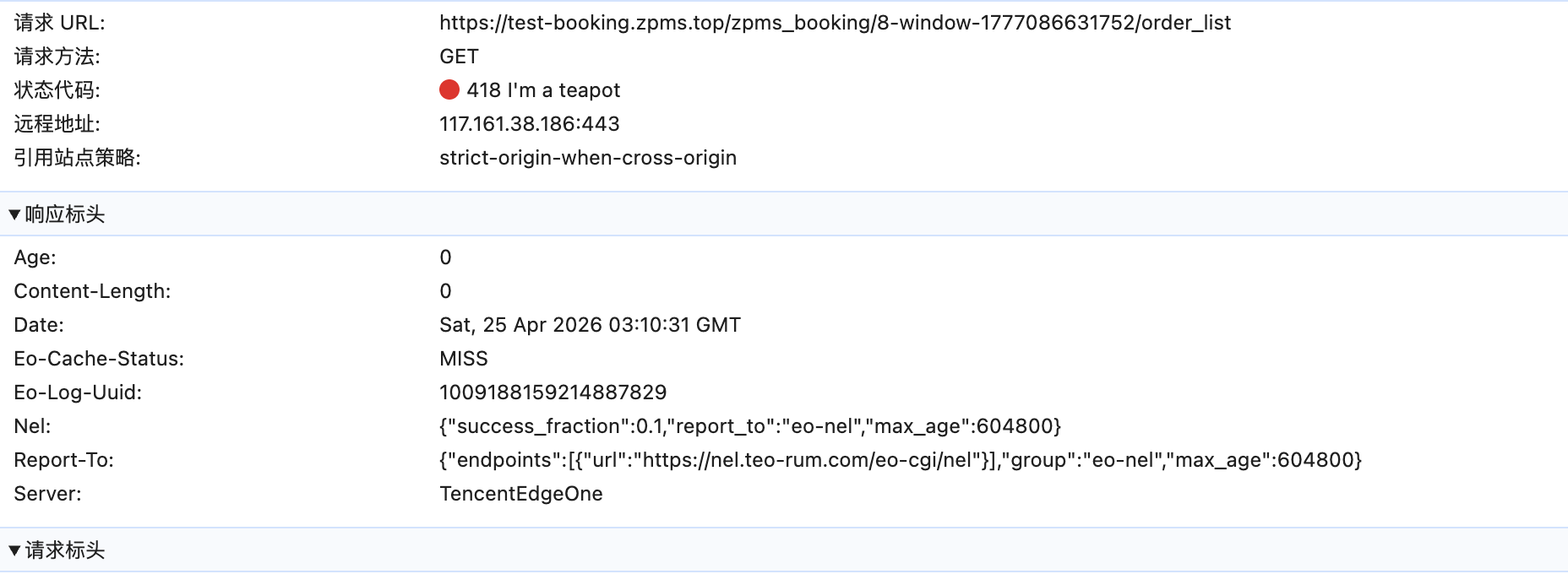 域名管理中也正确配置了域名,其它几个域名都没有问题,只有昨天新建的这个域名报 418?