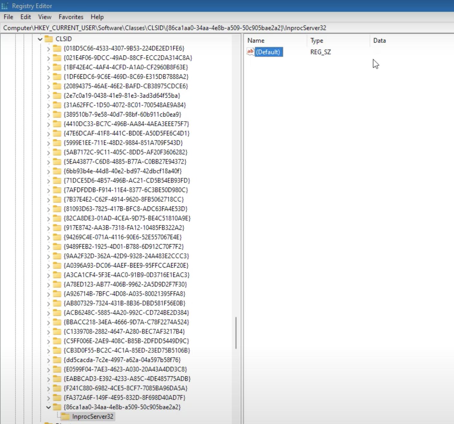 要做到这一点,只需在{86ca1aa0-34aa-4e8b-a509-50c905bae2a2}下添加带有子项InprocServer32的InprocServer32键,并确保在InprocServer32中"Data“列具有值,并设置为默认值,如下面的屏幕快照所示。