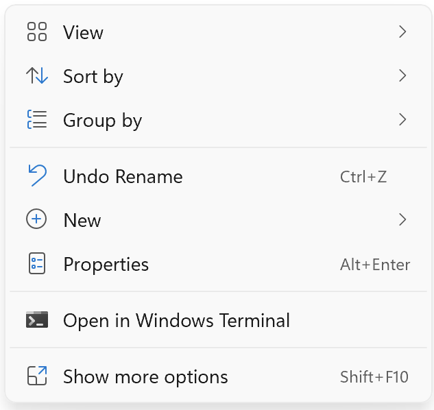 不幸的是,此时无法配置新的Windows 11上下文菜单。但是,作为一种可能的解决方案,默认情况下可以启用完整的上下文菜单(就像Windows 10中的那样)。它可以完成任务,但我不认为这是最优雅的解决方案。我想说的是,这并不是唯一的选择,但对一些人来说仍然是一种选择。