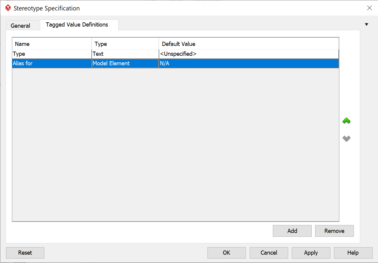 从那时起,对于每个具有<<Typedef>>原型的类,您都可以打开它的规范并丰富选项卡“标记值”,选择模型中的其他元素(不一定在相同的图表中)。