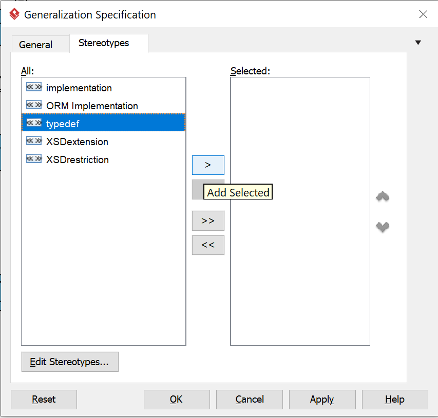然后在弹出窗口中,单击Edit Stereotypes...按钮。在新的弹出窗口中,单击Add...按钮,并在typedef中的新弹出类型中按原型。单击“确定”,然后创建新的原型,单击“确定”并将其添加到可用的原型列表中: