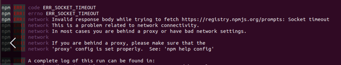安装软件包(npm)...npm错误!代码ERR_SOCKET_TIMEOUT npm错误!错误的ERR_SOCKET_TIMEOUT npm错误!网络无效响应主体试图获取https://registry.npmjs.org/@babel%2fplugin-proposal-nullish-coalescing-operator:套接字超时npm!网络这是一个与网络连接相关的问题。国家预防机制错误!网络--在大多数情况下,您是在代理后面,或者网络设置不好。国家预防机制错误!网络npm错误!网络如果你是一个代理,请确保npm错误!网络‘代理’配置被正确设置。参见:“npm帮助配置”