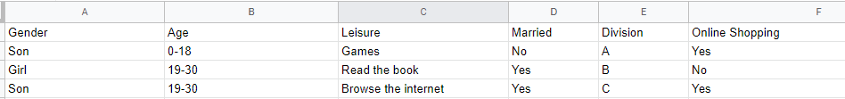 d = {'Gender': ['Son'], 'Age': ['19-30'], 'Leisure': ['Games'], 'Married': ['Yes'], 'Division': ['C']}