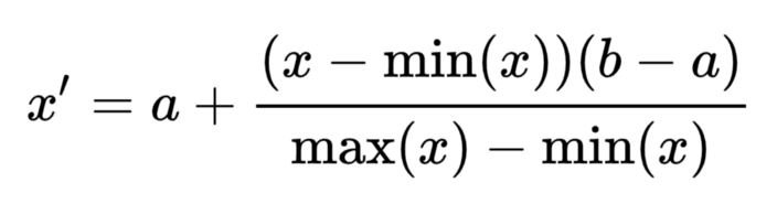 我们也可以对不同的间隔进行归一化,例如选择在任意a,b间隔中放置变量,a和b是实数。若要重新确定任意一组值a,b之间的范围,公式如下: