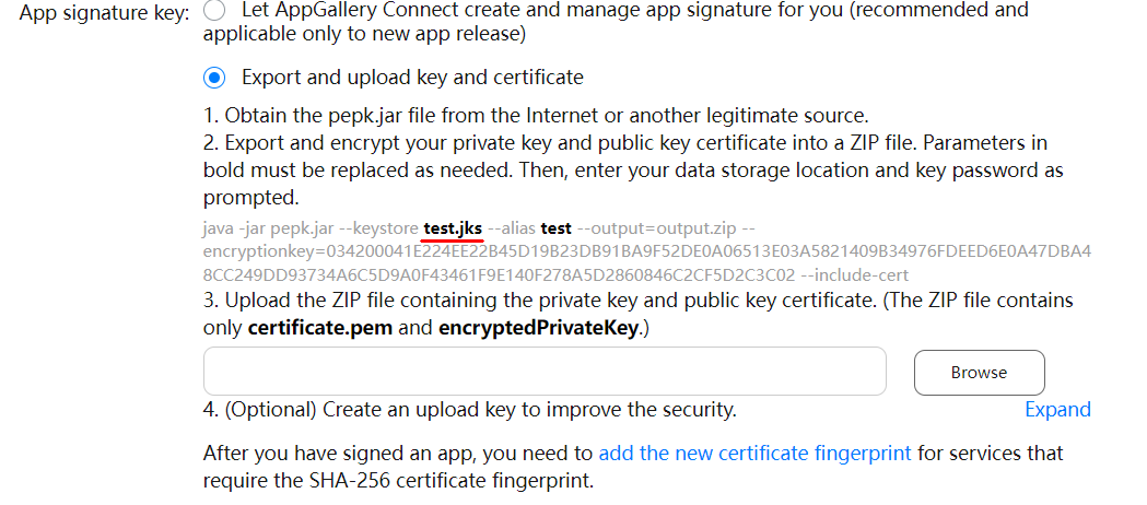 我想把我在google上发布的应用程序发布给华为appGallery。我使用了相同的.aab文件。我提取了这个带有extracted的aab文件,并管理了这个签名。然后,我在appGallery上共享了这个签名的应用程序。它说我必须安装一个带有.pem扩展的证书,这样我才能安装它。我创建了一个新的keystore jks和pem文件。我已将此pem文件添加到appGallery中。然后我的应用程序被发布了。