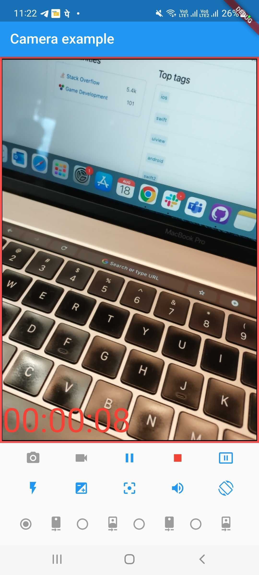 我想显示录像的持续时间,同时继续用颤振相机插件录像。但是,插件没有任何事件侦听器或其他方法附加开始和停止视频记录事件。当用户按下“开始记录”和“停止记录”按钮时,我可以计算持续时间,但我看起来更精确。