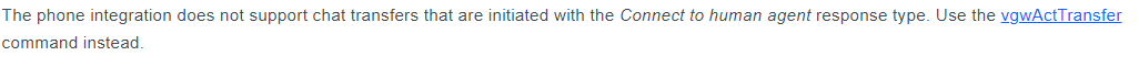 你好,我正在使用沃森助手的语音(使用Twilio ),我想转发呼叫到另一个号码,当用户想要连接到一个代理,或这是因为流量。我正在使用(https://cloud.ibm.com/docs/assistant?topic=assistant-dialog-voice-actions#dialog-voice-actions-transfer)中提到的以下方法。但是电话并不是只传送到最后。这里也有一些信息(https://cloud.ibm.com/docs/assistant?topic=assistant-deploy-phone#deploy-phone-transfer-service)