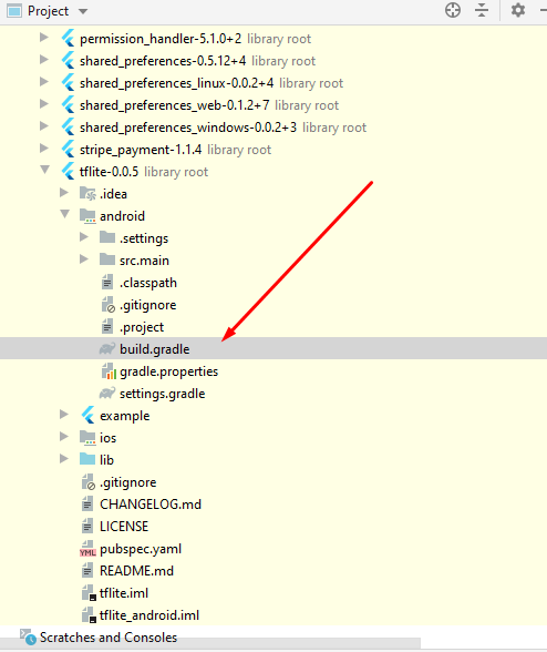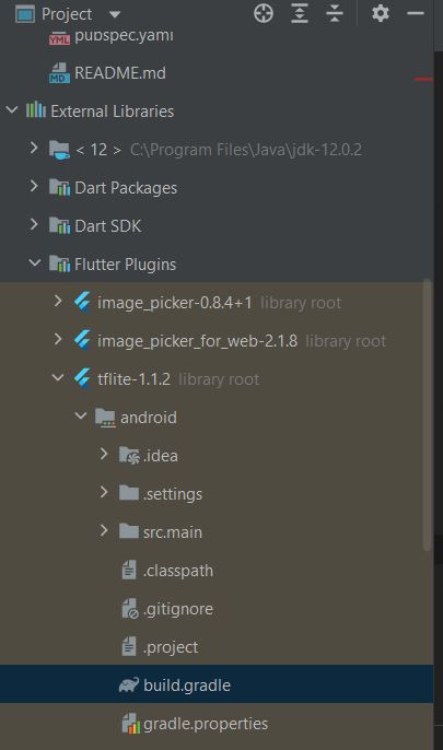 External libraries -> Flutter pluggins -> tflite-1.1.2 -> android -> build.gradle