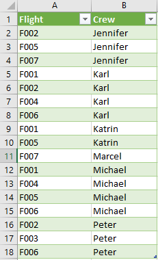#"Filtered Rows" = Table.SelectRows(#"Changed Type", each [Crew] = "J")如果将J放入excel工作表上的一个单元格中,并给该单元格以类似CrewName的范围名称,则可以在powerquery中引用该范围名称,并动态地进行筛选。