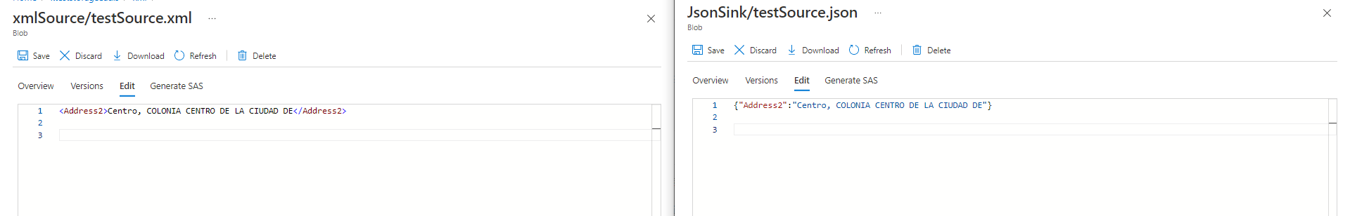"Address2":"test\\, test"如何在Azure data中删除带有复制数据活动的输出json中的双反斜杠?