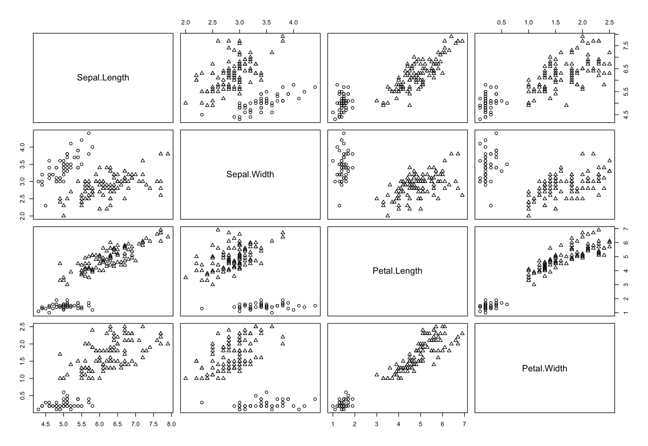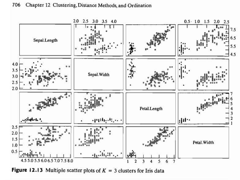 mc <- Mclust(iris[,-5], G = 2)如何创建像下面这样的图形?这是来自我的教科书:应用多元统计分析,约翰逊和威希恩。注意,这个图形在每个图形中有两个集群(正方形和三角形)。所以教科书上有个错误。教科书使用了两组。