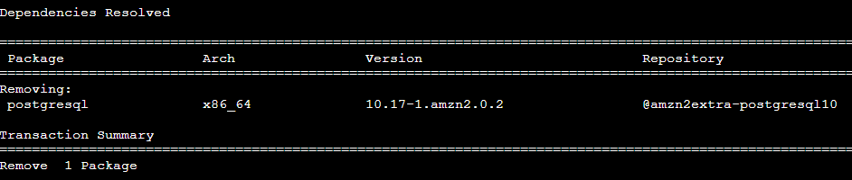 sudo yum remove postgresql为了确认我们正在删除使用amazon-linux-extras安装的内容,我们可以在运行sudo yum remove命令之后检查sudo yum remove: