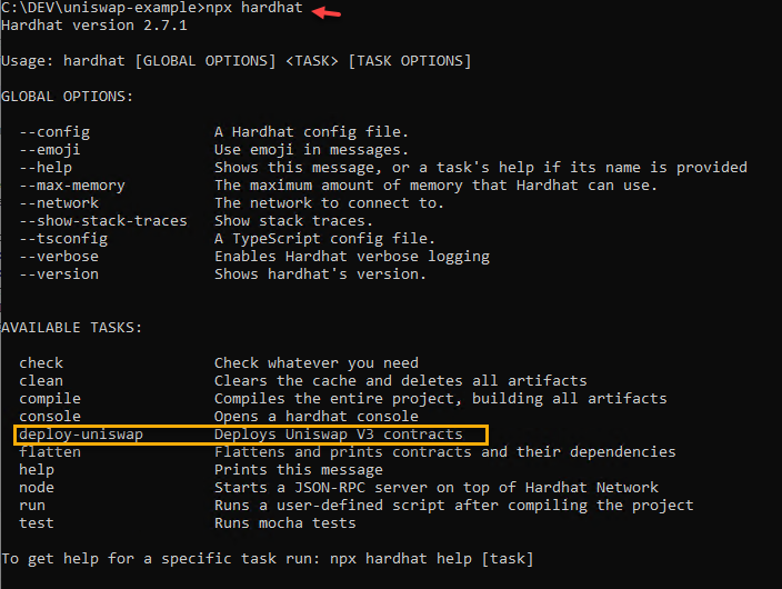 npx hardhat -我在可用任务中看到了“部署-uniswap”