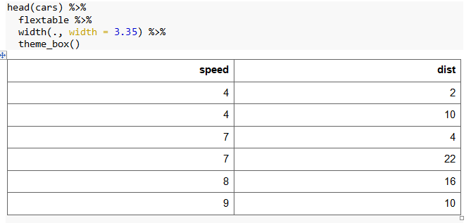 # Table 1 with 2 columns head(cars,3) %>% flextable %>% width(., width = (w/(ncol(cars)))) %>% theme_box() # Table 2 with 5 columnshead(iris,3) %>% flextable %>% width(., width = (w/(ncol(iris)))) %>% theme_box()