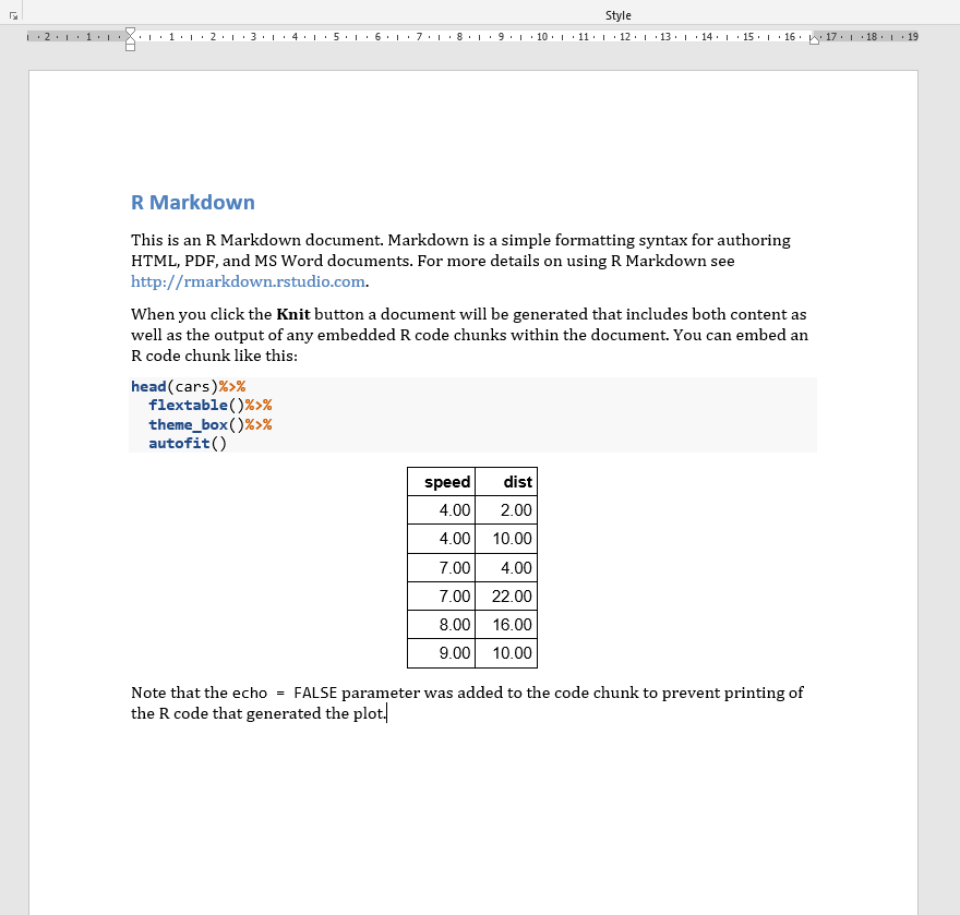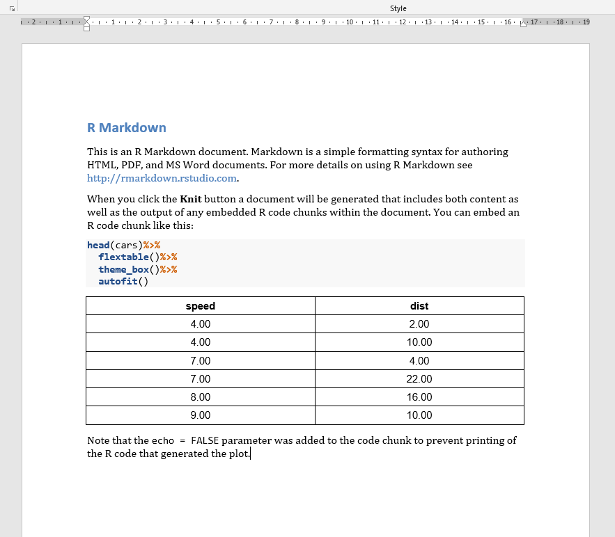 When you click the **Knit** button a document will be generated that includes both content as well as the output of any embedded R code chunks within the document. You can embed an R code chunk like this:
