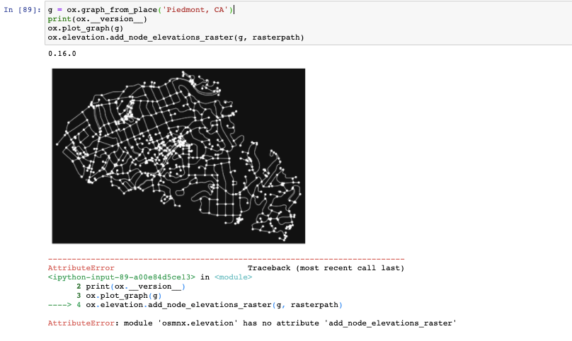 我正试图从栅格文件中获取高地,并添加到道路网络中。我得到模块'osmnx.elevation‘没有属性'add_node_elevations_raster’错误。