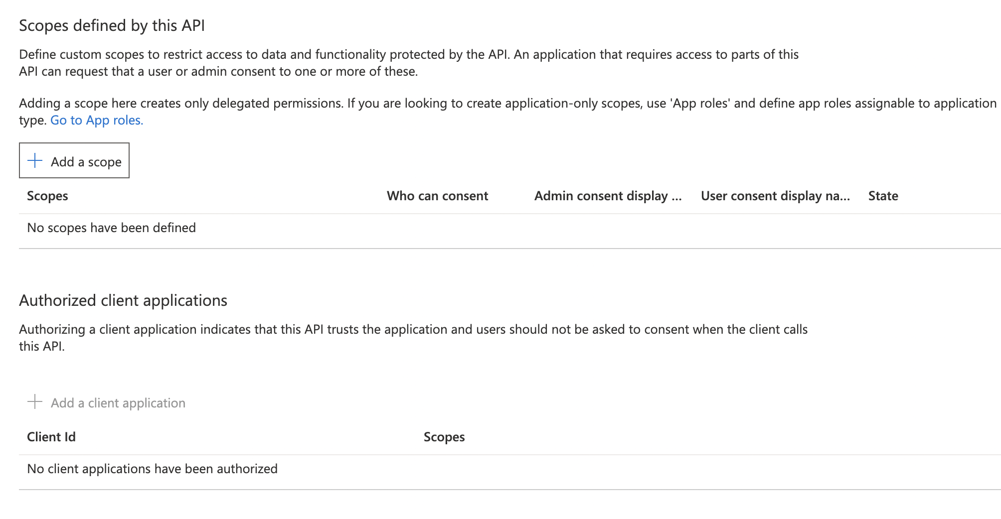 另外,请注意,在令牌配置选项卡中,还没有添加声明或组,没有添加API选项卡,也没有添加任何范围和授权客户端应用程序。如果我需要在这里做任何改变,请告诉我。