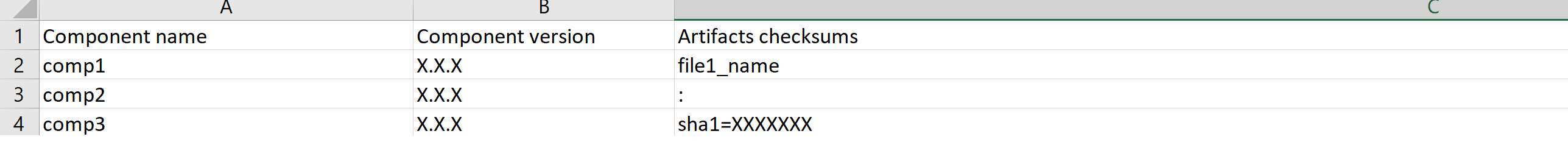# | Component name | Repo Path | Component Version | Path artifact Artifactory (URI) | SHA 256 of each file (checksums) | Path artifact Harbor | SHA 256 of each file