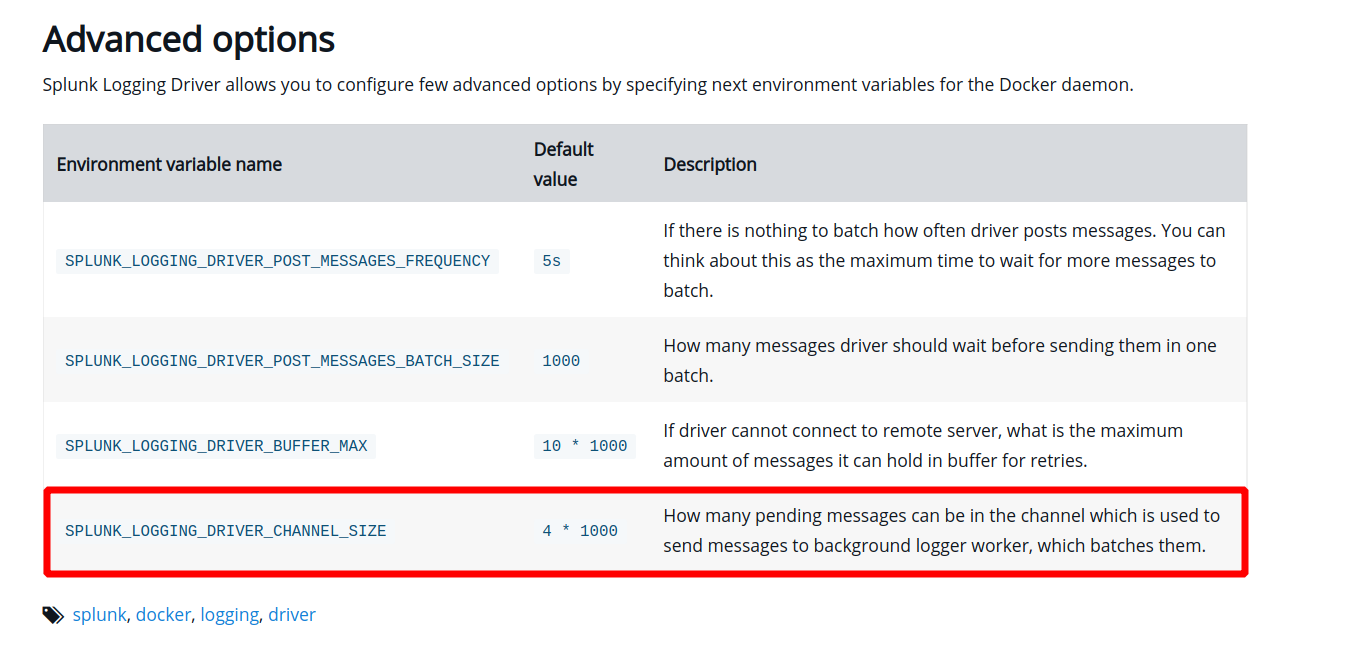 根据https://docs.docker.com/config/containers/logging/splunk/上的文档,4kb似乎是默认大小。