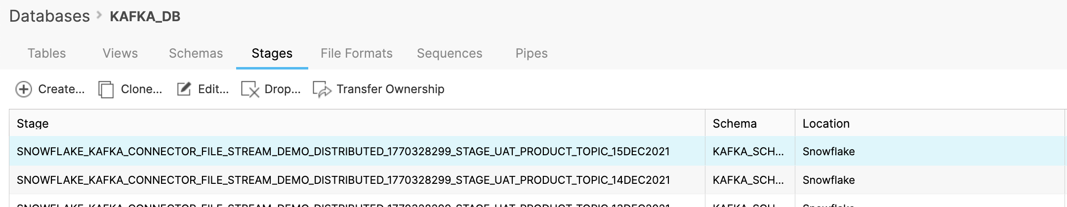 10097 [SF_KAFKA_CONNECTOR] uploadWithoutConnection successful for stageName:SNOWFLAKE_KAFKA_CONNECTOR_file_stream_demo_distributed_1770328299_STAGE_UAT_PRODUCT_TOPIC_15DEC2021, filePath:file_stream_dem o_distributed_1770328299/UAT_PRODUCT_TOPIC_15DEC2021/2/2653366_2653661_1639653551128.json.gz (com.snowflake.kafka.connector.internal.SnowflakeInternalStage:63)