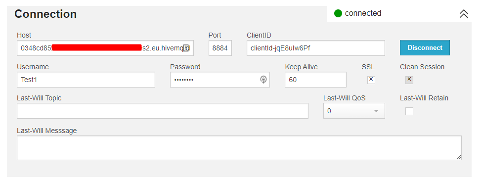 我已经为主机创建了MQTT凭据,并且能够通过示例客户机进行连接。这是那个客户的截图。