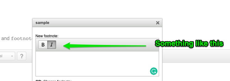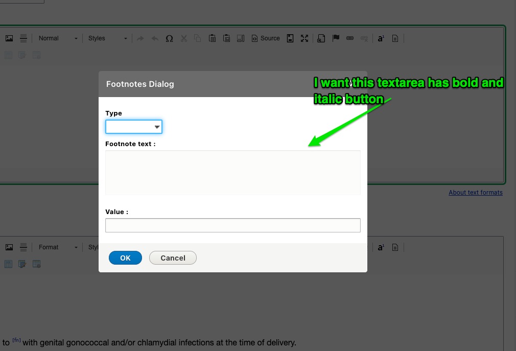 我有一个自定义的CKEditor按钮来打开一个对话框。在对话框中,我有一个文本区域类型,我希望它有“斜体”和“粗体”按钮,让用户在脚注文本中设置文本粗体和斜体。如何将意大利语和粗体添加到文本区域?