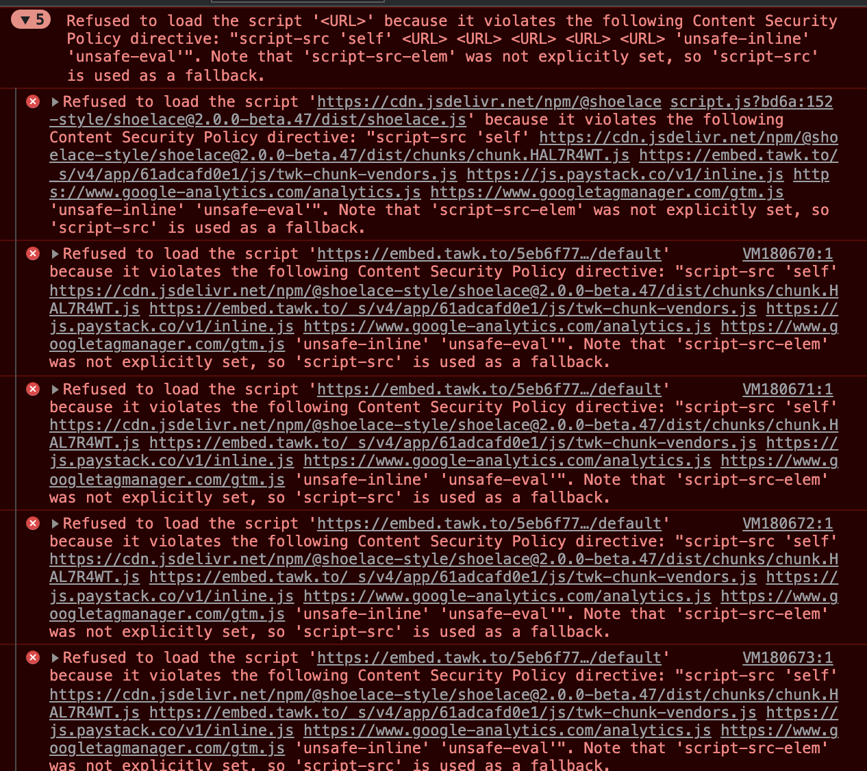 value: "default-src 'self' cdn.jsdelivr.net; script-src 'self' https://cdn.jsdelivr.net/npm/@shoelace-style/shoelace@2.0.0-beta.47/dist/chunks/chunk.HAL7R4WT.js https://embed.tawk.to/_s/v4/app/61adcafd0e1/js/twk-chunk-vendors.js https://js.paystack.co/v1/inline.js https://www.google-analytics.com/analytics.js https://www.googletagmanager.com/gtm.js 'unsafe-inline' 'unsafe-eval'; connect-src 'self' https://eljsuiwhwbb5lp5lmre5eifzuu.appsync-api.us-east-1.amazonaws.com https://embed.tawk.to https://va.tawk.to https://vitals.vercel-insights.com https://vsb75.tawk.to https://vsb89.tawk.to https://www.google-analytics.com wss://eljsuiwhwbb5lp5lmre5eifzuu.appsync-realtime-api.us-east-1.amazonaws.com wss://vsb75.tawk.to wss://vsb89.tawk.to; style-src 'self' 'unsafe-inline' https://cdn.jsdelivr.net https://embed.tawk.to https://fonts.googleapis.com; img-src 'self' data: https://embed.tawk.to https://res.cloudinary.com https://tawk.link https://www.google-analytics.com;",