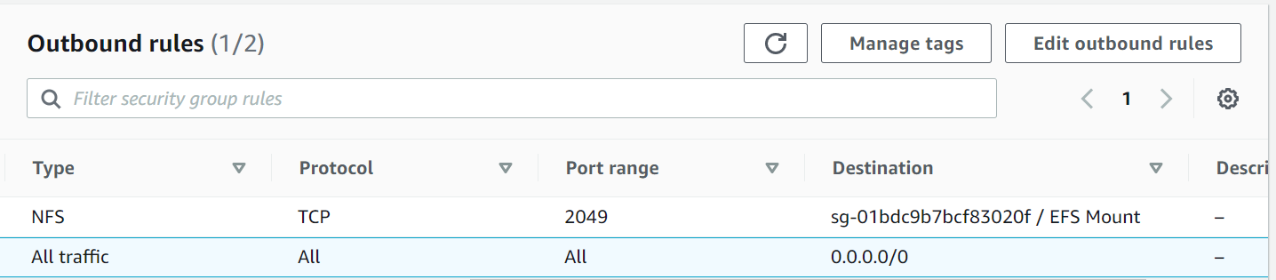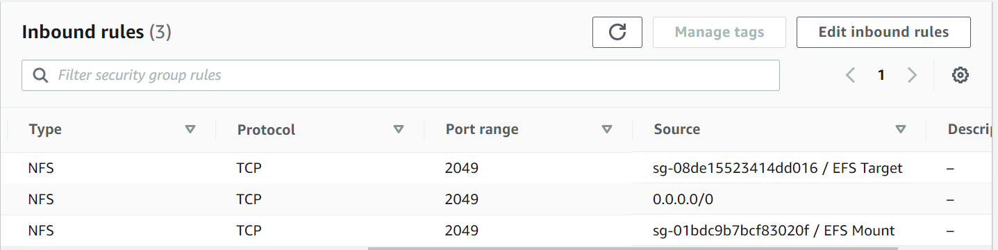 我添加了入站规则NFS,其中源作为EC2实例安全组和文件系统安全组。