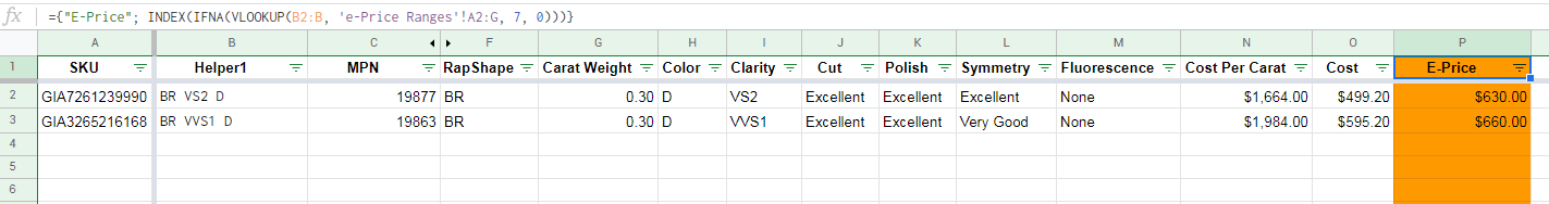 ={"E-Price"; INDEX(IFNA(VLOOKUP(B2:B, 'e-Price Ranges'!A2:G, 7, 0)))}