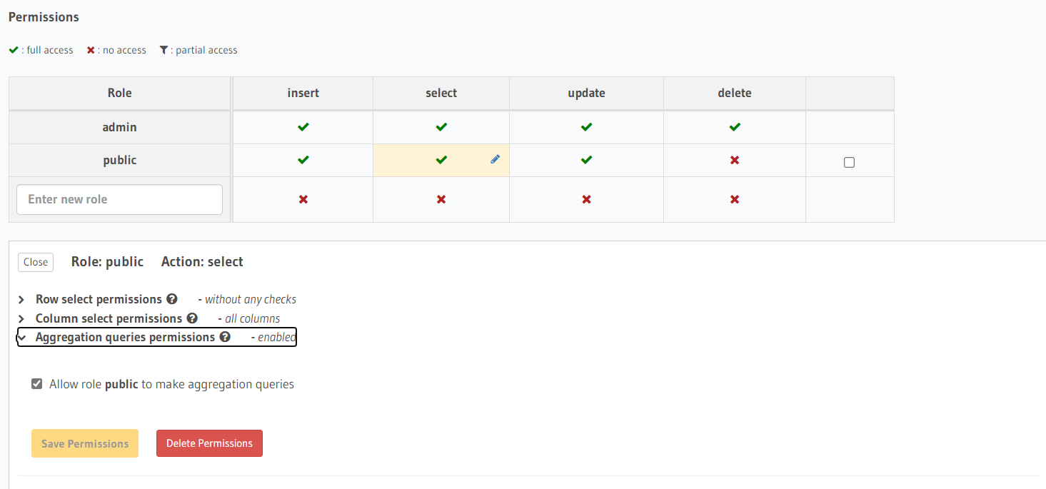 对于每个表Table -> Permissions -> Click select option on that role -> Aggregation queries permissions -> Enable -> Save
