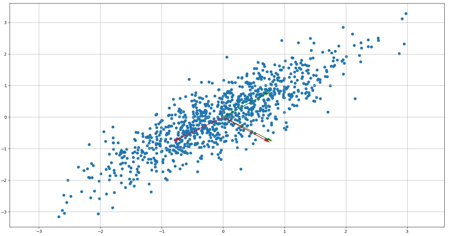 所以我认为,对于我的情况,如果我画出我从随机数据中得到的特征向量,也是正交的。但事实并非如此。他们的方向总是大致不同的。60度,而不是我所期望的90度。如果我使用sklearn库中的PCA,也会发生这种情况。请看下面的图片,红色是学习PCA的特征向量,绿色是我自己代码中的特征向量。
