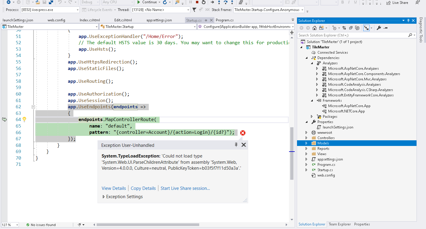 我的ASP.NET MVC Core3.0应用程序运行良好,在运行应用程序时突然面临错误。