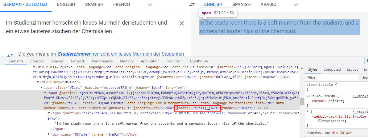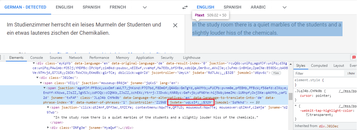 - "In the study room there is a soft murmur from the students and a somewhat louder hiss of the chemicals."- "In the study room there is a quiet marbles of the students and a slightly louder hiss of the chemicals."为什么使用Chrome浏览器翻译的德语"Murmeln“会被翻译成'murmur‘,而当使用Selenium访问同一页面时却被翻译成’弹珠‘呢?
