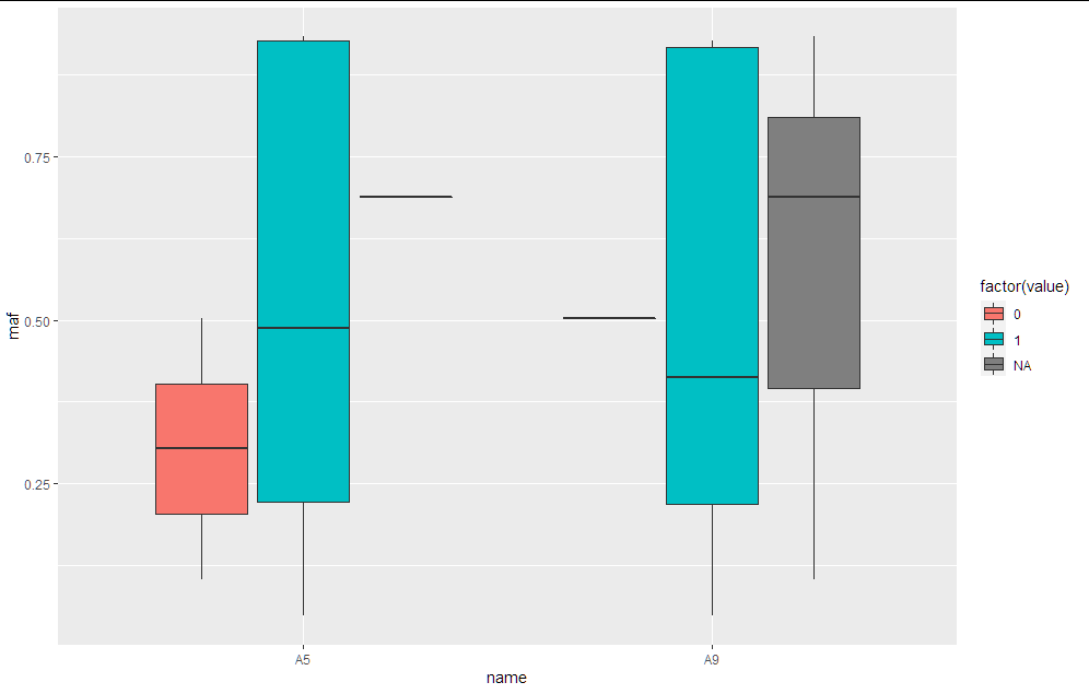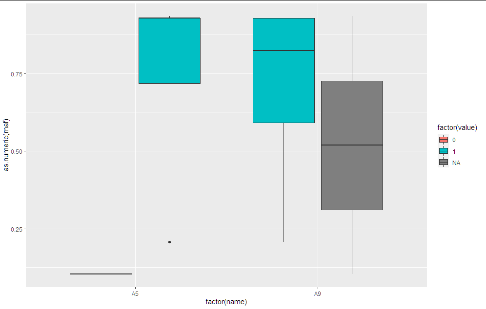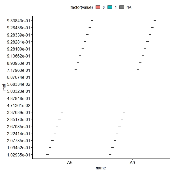 A5 (1,0和NA)下的三个变量,A9 (1、0和NA)下的变量。maf的相应值。我一直在试图绘制它们,但我要么只绘制了maf列,要么画了一个灰色的板子。任何帮助都是令人惊奇的,谢谢。-- A5 A9 maf