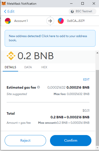 但是,当我在BSCscan测试网上检查事务详细信息时,它显示0值--接收方是契约地址而不是接收方。