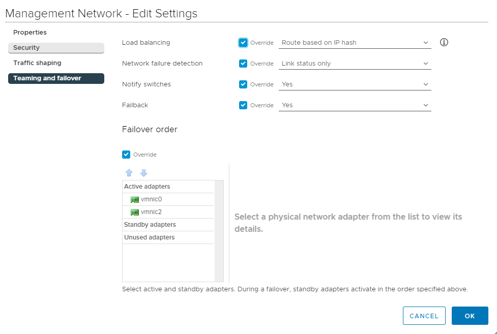 这是连接到vSwitch0的网络之一。我想取消“重写”,因为我希望它从主设置继承。问题是,我有几十个这样的东西,我想通过一个脚本来完成。我无法通过ESXCLI找到如何做到这一点。当您为portgroup创建特征时,会发生覆盖,请参阅下面的2注释删除。