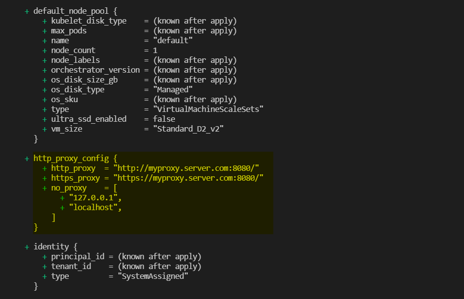 │ An argument named "http_proxy_config" is not expected here我做了:https://learn.microsoft.com/en-us/azure/aks/http-proxy checked:https://github.com/hashicorp/terraform-provider-azurerm/pull/14177