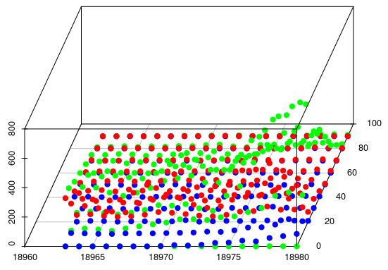 scatterplot3d(dateconverted[4500:5115], age[4500:5115], New_cases[4500:5115], color=c("red","blue","green")[Status_converted[4500:5115]], pch=19, angle=75)它提供了一些大致如下的内容: